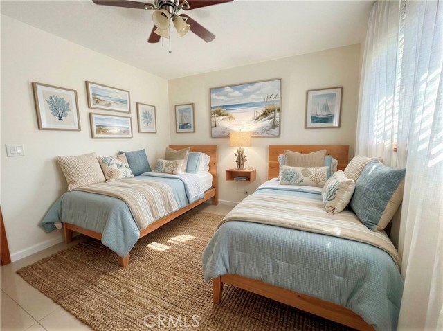 Spacious two-story 2-bedroom, 3-bath unit with a bonus bunk-bed loft, offering approximately 1,400 sq ft of well-designed living space. The bright main level features an open living, dining, and kitchen area with abundant natural light, a peaceful private patio, and a guest half bath. The kitchen includes a refrigerator, brand-new stainless steel LG dishwasher, gas range/oven, granite countertops, and ample cabinet storage. Upstairs offers two generously sized bedrooms, each with its own bathroom, floor-to-ceiling mirrored closets, ceiling fans, and comfort-height toilets. Additional features include porcelain tile and hardwood flooring throughout, wall-mounted AC units in every room, and a versatile loft ideal for guests or flexible living space. Well-maintained, quiet community with on-site laundry featuring Speed Queen commercial machines. Reserved parking and garage options available. Water and trash included; tenant pays gas and electric. Pet-friendly with deposit and monthly pet rent. Ideally located across from Bella Terra Mall and minutes to major shopping, dining, beaches, parks, and easy 405 freeway access. Some photos have been virtually staged for illustration purposes only.