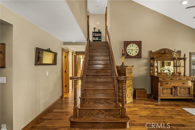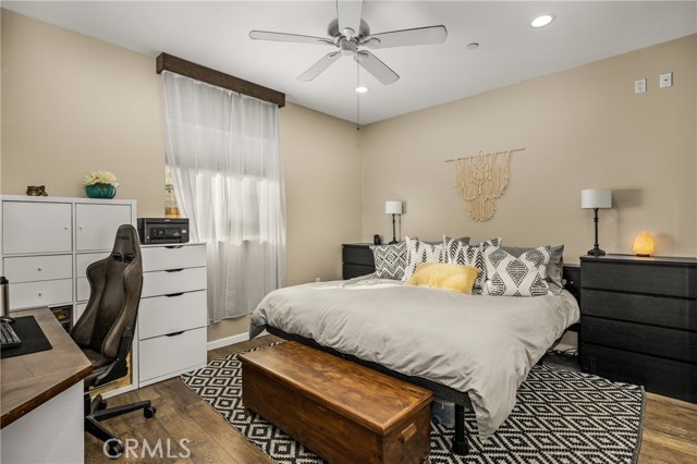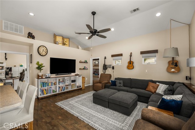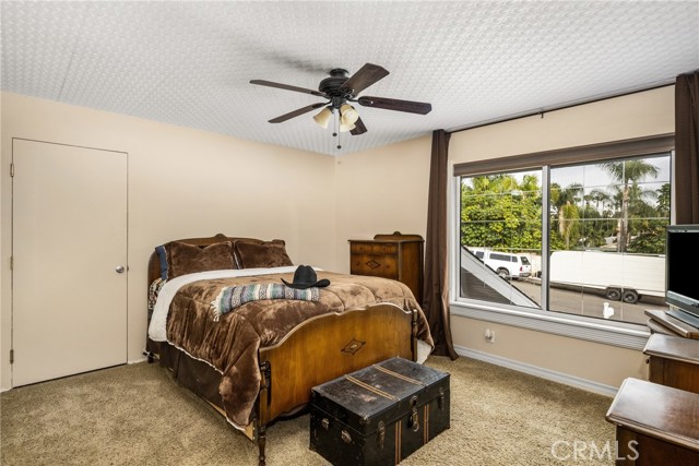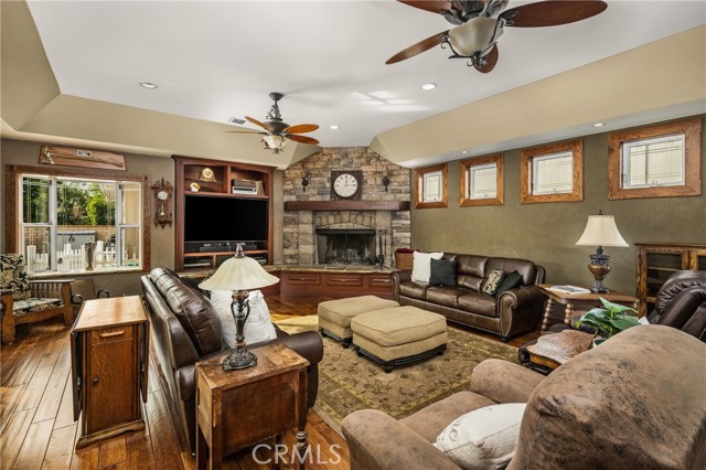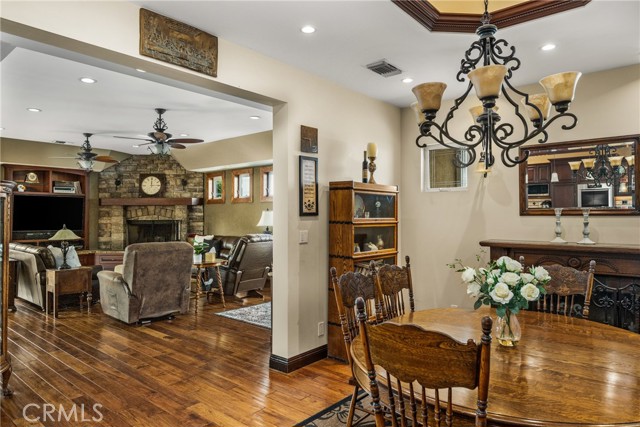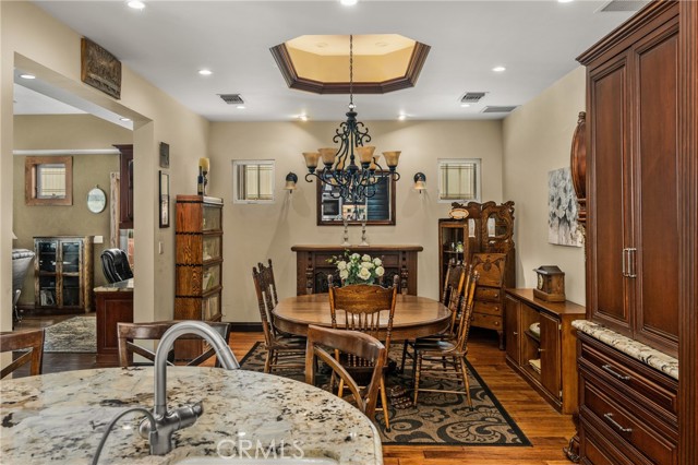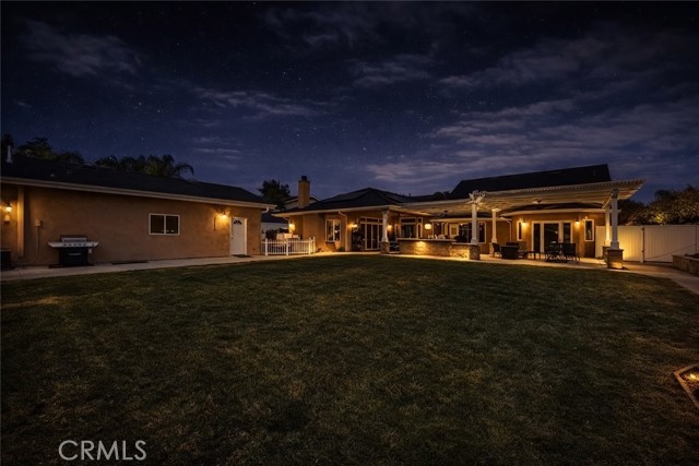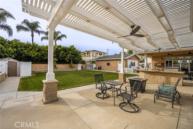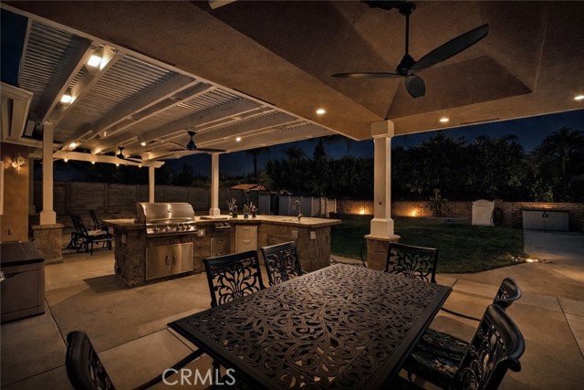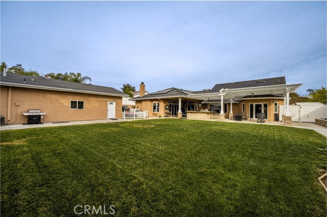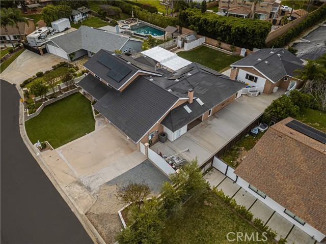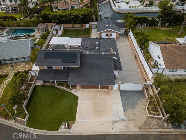 This 5 bed, 3 bath home with a 2 bed 1 bath ADU and RV parking on an oversized lot with solar panels is perfect for multigenerational living and is in one of Yorba Linda’s most desirable neighborhoods! Main lives like a single level with the primary suite, two bedrooms/one bath on the first floor and two beds/one bath upstairs. The detached ADU offers potential for income, and the RV driveway has electricity and dump station. For those warm Summer nights, the extended roof patio spans the front of the home and your lawn will always look mowed with the manicured artificial turf. The RV gate is 17 ft wide and the driveway is over 60ft long and 18ft wide from eves to wall along side the 3 car garage. Inside, views to the backyard, vaulted ceilings, and a warm wood floor greet you. The classic kitchen is beautifully appointed with top-of-the-line appliances including a Sub Zero refrigerator, Dacor 5 burner stove, Miele double ovens and warming drawer, Kitchenaide stainless dishwasher and fridge with panel doors matching the cherry cabinets with beading. A Farmhouse sink and solid maple pullout drawers including a spice rack, and two lazy Susans with many soft close drawers make this kitchen as functional as it is beautiful. The spacious island showcases Splendor granite, a separate sink and seating for three. The ample cabinetry also offers a coffee cabinet and Splendor backsplash diamond cut outs. An abundance of lighting tops it off. The large dining area can accommodate a 12 ft table and has fireplace. Everyone will come hang out in the huge room with the stone covered fireplace and hearth. The windows and the sliding glass door to the outdoor kitchen bring lots of light. Built in cabinets and desk span one whole wall. Step out to the patio where you'll find an outdoor kitchen that was recently constructed with concrete counters, a Blaze BBQ, 2 burner stove, sink and garbage disposal. Green grass, avocado trees, and the ADU are surrounded by concrete and slump stone walls. The 920 foot ADU hosts 2 bedrooms and 1 bath with kitchen overlooking a very spacious gathering area, and outside is a gated artificial turf yard. Step back into the primary room doors in the main house to find a spacious room with a wall of closets, walk in shower in the primary bath and down the hall 2 bedrooms with wood floors and the hall bath with tub. Up stairs you’ll find 2 more bedrooms and a hall bath with a shower. Shopping, theatre, Yorba Linda lakebed and great schools.