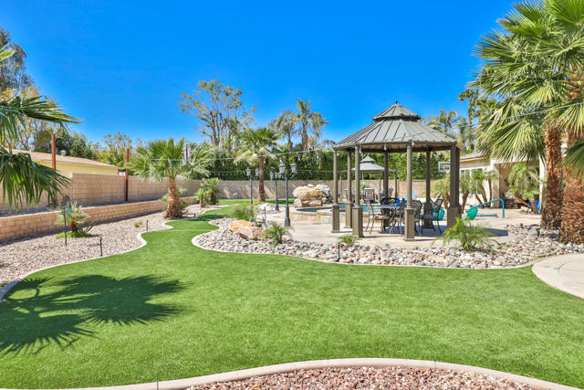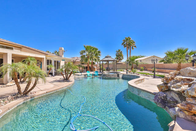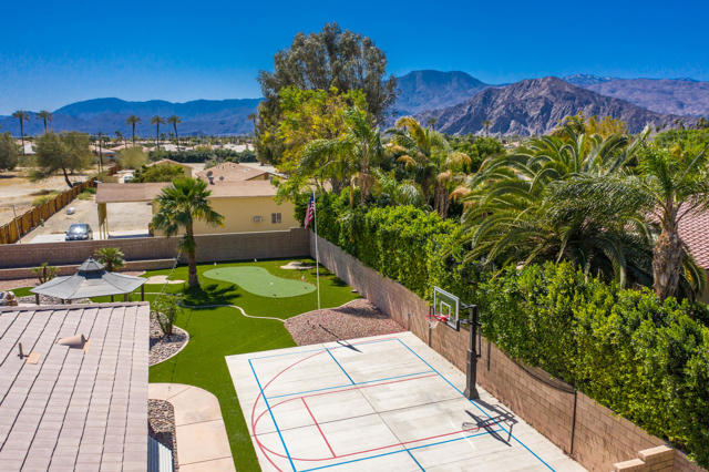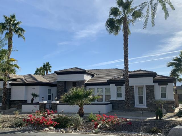 AVAILABLE ALL MONTHS!! Located in Desert River Estates located near the Polo Grounds where Coachella, and Stagecoach music festivals take place. It is spacious inside and has a great pool and outdoor relaxing area with mountain views. The great room has plenty of seating for your guests, the 65 inch flat screen TV or a quiet evening enjoying a roaring fire or glorious mornings allowing the natural beauty and sunlight to come in through the vast glass windows and doors. This home is set up perfect for entertaining with the seamless flow from the living area to the gourmet kitchen hosting stainless steel appliances including double ovens, granite countertops and a large island. The island comes equipped with 4 barstools for quick dining, adjacent to the kitchen table for 6. For more elegant dinners, the dining room offers seating for 8. The master suite offers a king bed, flat screen and private exit to the back patio. The master bath offers his and her sinks, a vanity area, soaking tub with a separate walk in shower. The second suite offers a queen bed, flat screen and a private full bath. The third bedroom hosts a queen bed and fourth bedroom hosts two twin beds, flat screens with a Jack and Jill bath. The fifth room doubles as an office and an extra bedroom with a daybed with a trundle below. The back patio oversized pebble-tec pool with a tanning shelf, pool umbrella and pool lounge chairs. Built in BBQ & Basketball court. Pack your bags..
