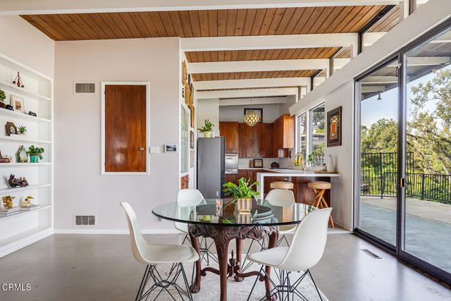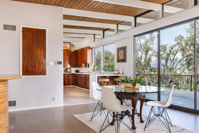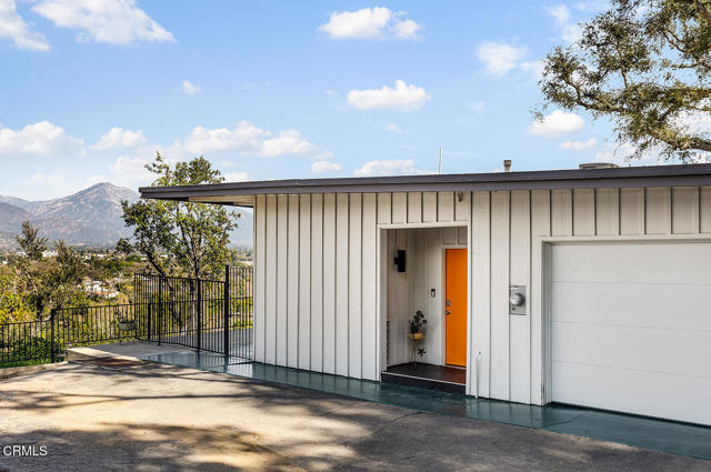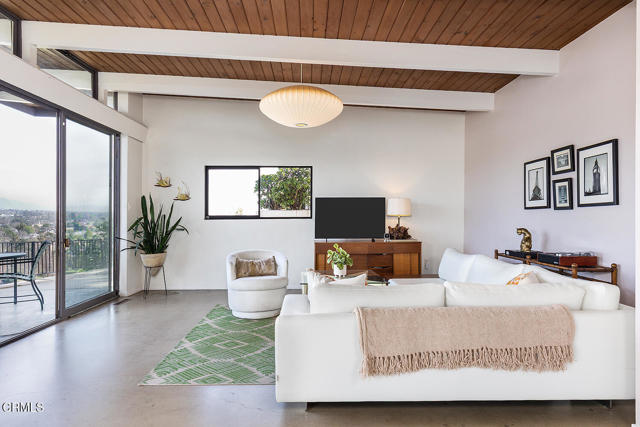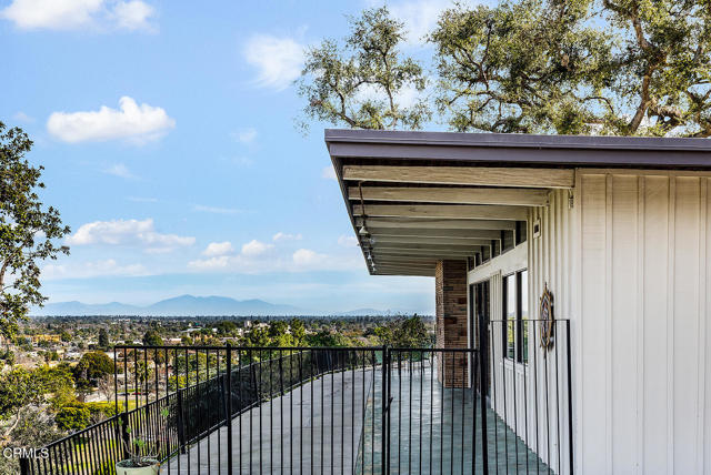 Views! Perched in Pomona's desirable Ganesha Hills neighborhood, this gorgeous Mid Century Modern home is sited on an expansive, scenic lot. Surrounded by mature oak trees, the property offers privacy and sweeping, unobstructed views of the city and the San Gabriel Mountains. Just minutes from downtown Pomona, the Claremont Colleges, and the 10 Freeway, the location combines scenic foothills living with convenient access to nearby amenities. Inside, classic mid century architectural elements define the open plan. Tongue and groove ceilings span the living areas, complemented by exposed wooden beams and concrete floors. Walls of glass with clerestory windows above invite natural light while framing the panoramic views. A formal entry finished with terrazzo tiled floors reflects the home's original architectural character. The open concept layout allows the living and dining areas to flow seamlessly, oriented toward the views and anchored by a stone, wood burning fireplace. A Nelson Bubble Pendant fixture highlights the living room, reinforcing the home's iconic mid century aesthetic, while the kitchen retains original cabinetry, built-in storage, warm toned finishes, and a Lightolier Ribbon Chandelier, giving the home a timeless and historic feel. The primary bedroom includes a walk-in closet with custom doors, and the bath has been updated with terrazzo tiled floors, double sinks, custom cabinetry, a walk-in shower, and refined wall finishes. A spacious basement provides flexible additional space that may be used for storage, office space, or future customization. Outside, the exterior showcases classic board and batten siding. A private driveway leads to a generous lot with a dedicated gardening area along the side of the property. A balcony stretching over 100 feet offers sweeping 220-degree views of Mount Baldy, San Jacinto Peak, and the San Gabriel Mountains, creating an ideal setting for relaxing or entertaining. Nearby attractions include Bonelli Park, the Fairplex, and local dining destinations, adding to the appeal of this special setting. This is a rare opportunity to own a classic Mid Century Modern estate in a highly desirable neighborhood, with sweeping views and a convenient location.