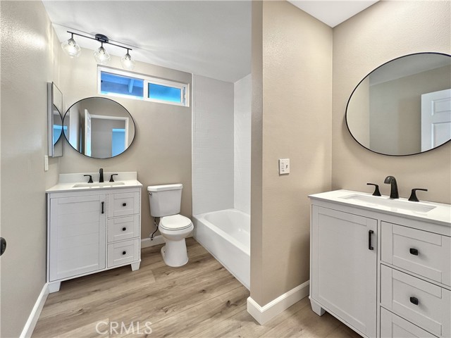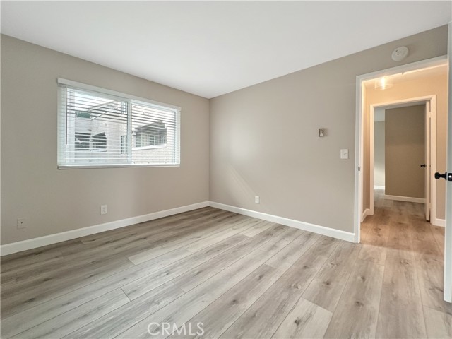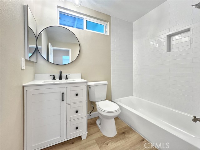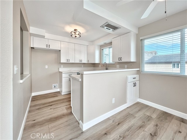 Mid-century modern style remodeled ground floor single-story home. Home was refreshed in 2024 with all new luxury vinyl flooring throughout, fresh paint, designer baseboards, updated lighting and hardware, and is move in perfect! Kitchen has with bright white cabinets, quartz counters & stainless-steel appliances. Bathroom has been expanded and is oversized, with two separate white vanities, black fixtures and mirrors, and tub/shower combo. Quiet location at rear of property offers privacy, and your own patio off generous living room. 1 car garage is included, and laundry facility is onsite for your convenience. Come take a look! You won't be disappointed.