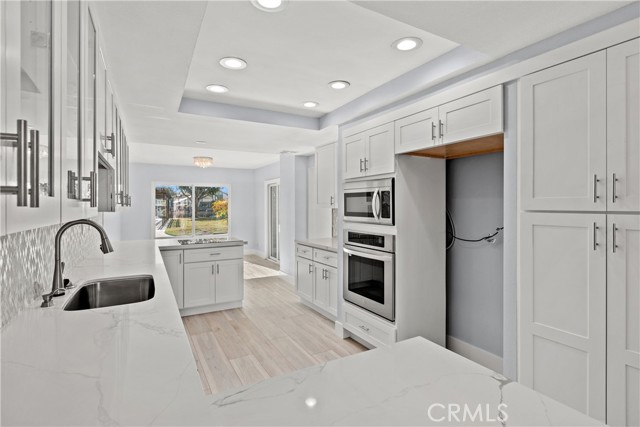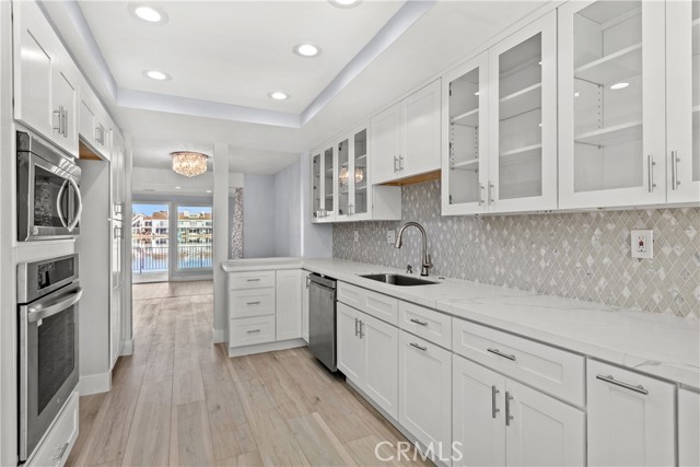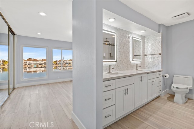 Experience elevated coastal living in the heart of Huntington Harbour — one of Southern California’s most prestigious waterfront communities. This ultra-rare, fully renovated 3-bedroom, 2.5-bath marina-front townhome offers breathtaking, panoramic water views from every room. Perfectly positioned between a tranquil lagoon on one side and the deep-water marina on the other, the residence captures the essence of luxury harbor living with unmatched serenity and natural light throughout. No detail has been overlooked in this top-tier renovation. The designer kitchen is a showpiece, featuring custom soft-close white shaker cabinetry with roll-out drawers, striking quartz countertops, a bespoke backsplash, premium stainless steel appliances, a spacious pantry, and a charming breakfast nook — ideal for both refined entertaining and everyday indulgence. The expansive living and dining areas seamlessly open to a large private waterfront balcony through sliding glass doors, creating an effortless indoor-outdoor flow and the perfect setting for sunset evenings over the marina. Upstairs, the primary suite is a true retreat, showcasing spa-inspired finishes including a frameless glass shower, dual vanities, and generous his-and-hers closets. Every upgrade reflects thoughtful luxury: dual-pane energy-efficient windows, LED recessed lighting, new baseboards and casings, Kohler fixtures, mirrored closet doors, and wide-plank wood-inspired flooring throughout. The versatile third bedroom or bonus room offers flexibility as a private office, guest suite, or creative space. Additional highlights include a private two-car garage, ample guest parking, and a dedicated laundry room. Residents enjoy resort-style amenities including two clubhouses, two sparkling pools, and multiple tennis courts — all just moments from the sand, boating channels, waterfront dining, and the coastal lifestyle that defines Huntington Harbour. Wake each morning to shimmering water views, sip coffee on your private patio, and embrace the sophistication of true waterfront luxury.