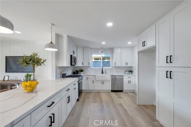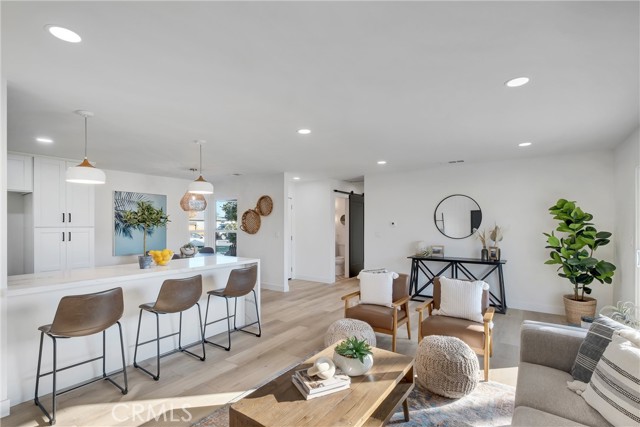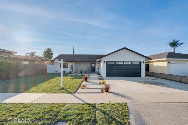 Absolutely breathtaking Huntington Beach home, nestled in a beautiful family neighborhood, completely re-imagined from top to bottom, inside & out in 2022! Every detail of the home has been meticulously taken into consideration, with impressive features, layout, and flow inspired by a professional design team. Some details include: breath-taking kitchen and bathrooms, whole house re-pipe, dual pane windows, new hardscape & landscape, finished garage, etc!! The dining area is appointed with massive windows and a boho style chandelier, bringing beautiful light into the space. The kitchen features a massive 8 foot peninsula with waterfall finish, crisp shaker cabinetry, and modern lighting and fixtures. The main living area features stunning floor to ceiling wide plank vertical shiplap that brings texture and personality. Your primary bedroom retreat features an enormous bathroom with stylish and unique finishes, not normally found in other homes on the market. The guest bathroom is extremely impressive with fun pattern tiles, a beautiful vanity, and gorgeous fixtures. Some additional key notes of the home include mentioning the large front and back patios, new landscape, concrete and hardscape, automatic sprinklers, finished garage with recessed lighting, epoxy flooring and newer garage door, Eternity Brand vinyl plank flooring, Bedrosian's tile & stone, Plantation shutters, Samsung appliances, Starbridge custom windows, black barn doors, recessed lighting, custom black modern fixtures, back patio pergola with retractable awning & so much more! This one level home is absolutely stunning with unbeatable curb appeal and great neighbors! Close to Huntington Harbour, Bolsa Chica State Beach, Sunset Beach, Seal Beach, shopping, dining, amazing schools, and easy access to the 405 & 22 Freeways