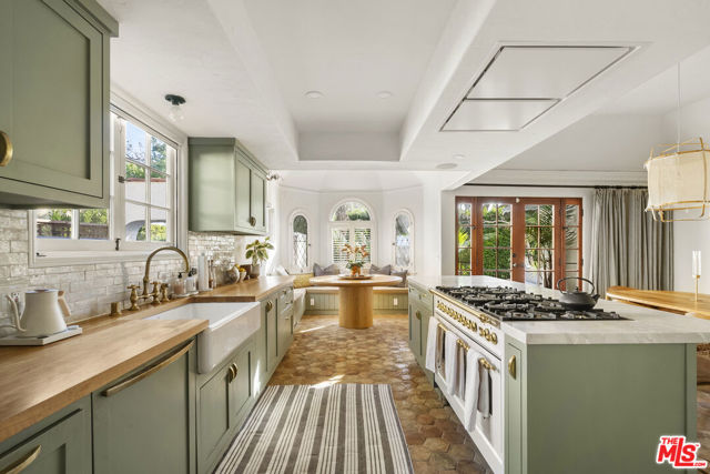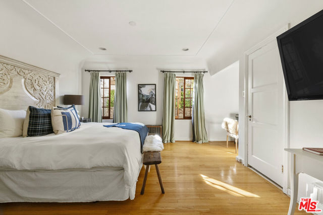 Stunning, fully renovated Spanish-style home in the heart of Beverly Grove, offered fully furnished. This private, fully hedged and gated property seamlessly blends authentic Spanish architectural charm with modern luxury throughout. A picturesque gated courtyard welcomes you with a romantic stacked-stone koi pond. Inside, the living room features tall ceilings, a large floor-to-ceiling window that brings in abundant natural light, and a beautiful fireplace. The dining room offers French doors that open to a private patio, creating effortless indoor-outdoor flow. The custom-remodeled kitchen is equipped with top-of-the-line appliances, custom built-ins, and a wonderful breakfast nook, designed for both beauty and function. The sensational primary suite is complemented by rich hardwood floors, coved ceilings, and a luxurious primary bathroom. The home opens to a professionally landscaped backyard retreat complete with a stunning pool, spa, and outdoor dining area. A large cabana/updated ADU has been transformed into a fully equipped gym with a steam room, sauna, and versatile flex space. Gated for ultimate privacy and ideally situated on one of the most coveted streets between The Grove and The Beverly Center, just moments from the shops and restaurants of 3rd Street, this extraordinary residence offers refined living in the very heart of the city.
