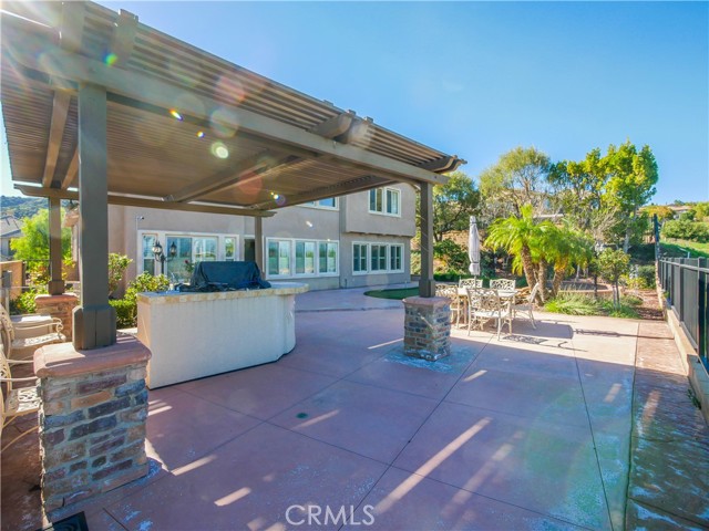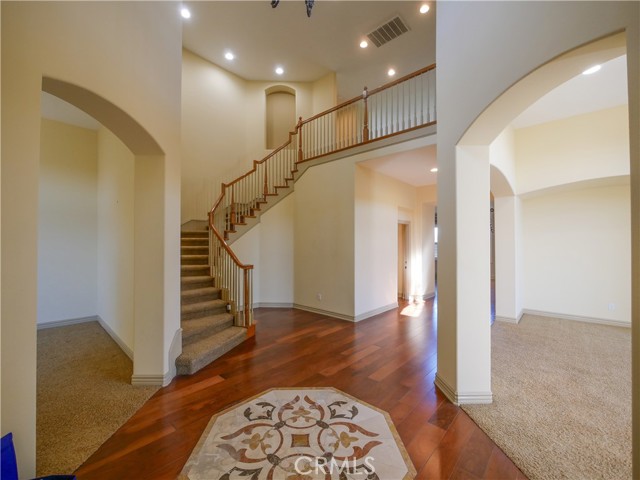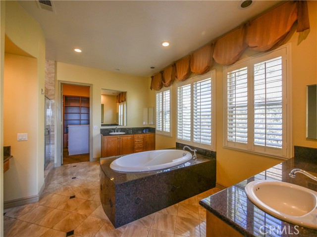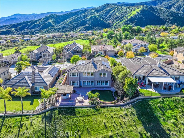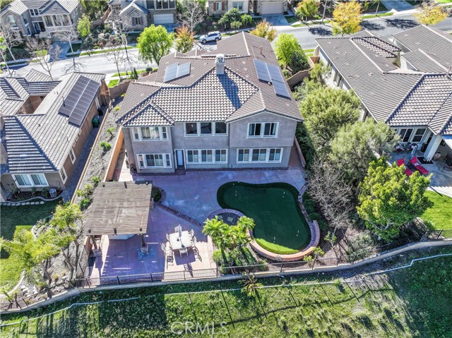 Located in the guard-gated community of The Retreat in Corona. Prestigious home spanning 4,555 square feet on a serene quarter-acre lot, this 5 bedroom, 4.5-bathroom masterpiece is designed for both luxurious living and seamless entertaining. As you enter through the private courtyard, you are greeted by soaring 20+ foot high ceilings that create an airy and inviting atmosphere. The formal dining room and living room provide the perfect backdrop for exquisite gatherings. The expansive family room, also boasting 20-foot ceilings, invites relaxation and connection, making it the heart of this stunning home. The gourmet kitchen is a culinary enthusiast's dream, featuring an island, a spacious kitchen nook, a large pantry, sleek black appliances and abundance of cabinetry that caters to both functionality and style. The highly sought-after downstairs primary suite offers a serene retreat, with a captivating ensuite bathroom featuring double sinks, a separate sitting vanity, large walk-in shower and soaking tub. The walk in closet includes an abundance of storage for your everyday or evening wear. Upstairs includes two separate junior suites —each with their own private baths and walk-in closets—provide guests or family members with ultimate comfort and privacy. The front bedroom includes a charming private balcony and a built-in desk, ideal for quiet reflection or productivity. Two more secondary bedrooms frame the other wing of the second floor. The beauty of this home extends beyond its interiors. With exquisite wood and stone flooring throughout, every inch has been crafted with care. The expansive backyard is a private oasis with a serene rock fountain, perfectly sized and adorned with a putting green, built-in BBQ island complete with burners, sink and a fridge surrounded by custom hardscaping, making it an entertainer’s paradise. Every window frames a picturesque view of the mountains. The Retreat is the Inland Empire's premier 24-hour manned gated community.