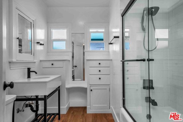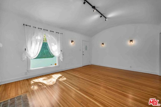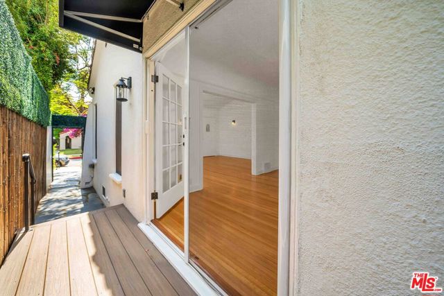 Newly remodeled 2-bedroom, 1.5-bath residence in a prime Beverly Hills location, offered as one of two homes in a charming side-by-side duplex. With its own address, private entrance, and no shared common living spaces, the home offers a rare sense of privacy and a single-family-style living experience in the heart of the city. Surrounded by lush landscaping, the residence features French windows in both the living and dining rooms, a decorative Batchelder fireplace, and expansive living and dining areas highlighted by original oak hardwood floors throughout. The updated kitchen is appointed with new cabinetry, quartz countertops, and stainless-steel appliances, including a range with overhead vent, dishwasher, and refrigerator. The dining room opens to a side yard and provides convenient access to both the front and rear of the property. A private patio with a retractable automated awning creates a welcoming outdoor setting, ideal for morning coffee or relaxed evening entertaining. Additional highlights include central heating and air conditioning, a private laundry room with new washer and dryer, located (reserved exclusively for this residence), plus additional storage space. The property also includes controlled access to a two-car garage with EV charging capability, offering flexibility for parking or potential use as a home office, gym, art studio, or creative workspace.