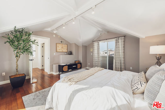 Located just moments from the ocean, Palisades Park, Montana Avenue, and the 3rd Street Promenade, this move-in-ready Santa Monica townhome offers the privacy and feel of a single-family residence within an exclusive five-unit gated community. The spacious 3-bedroom plus loft, 3-bath layout features a dramatic light-filled living room with soaring 20-foot ceilings, a double-sided fireplace, and hardwood flooring throughout. The recently remodeled chef's kitchen includes stainless steel appliances, wine refrigerator, stone countertops, center island, and opens seamlessly to the dining area for entertaining. An expansive loft overlooks the living space and provides flexible use as a den, office, or media area, with balconies on both ends. The primary suite is a private retreat with a beautifully updated spa-like bathroom with dual vanities, free standing tub, and dreamless glass shower with rainfall shower head, while the top-floor bedroom opens to a large rooftop terrace with city views and peek-a-boo ocean vistas. Additional highlights include EV-ready secure parking with direct access, in-unit laundry, ample storage, low HOA dues, abundant natural light, and excellent walkability to the beach, shops, restaurants, and weekly farmers market.