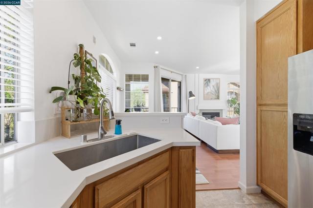 A quiet end-unit condo located in the desirable Torrey Pines community. This 2-bedroom, 2-bath home offers approximately 960 square feet of thoughtfully designed living space. The open-concept layout is filled with natural light and features a cozy fireplace and a private balcony. The updated kitchen includes modern countertops and backsplash, stainless steel appliances, well-maintained cabinetry, and recessed lighting. The primary suite features vaulted ceilings, a skylight that brings in natural light, and an updated vanity area. Additional highlights include interior storage and designated parking. Residents enjoy community amenities such as a pool and spa. Ideally located with convenient access to walking trails throughout the Windemere and Alamo Creek areas, as well as nearby shopping and dining. Commuters will appreciate the close proximity to BART and the 580/680 corridor.