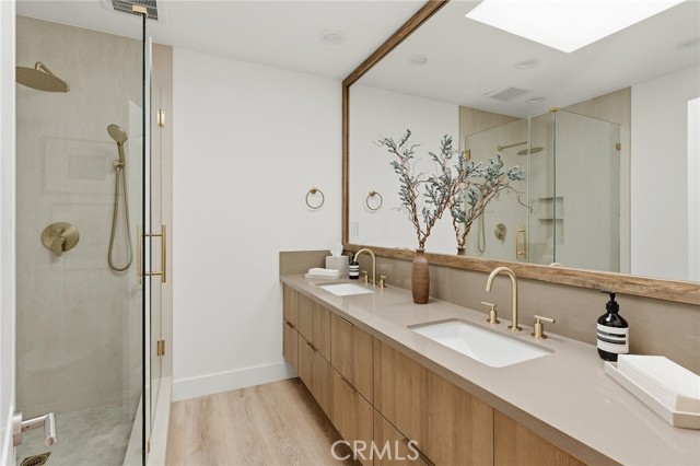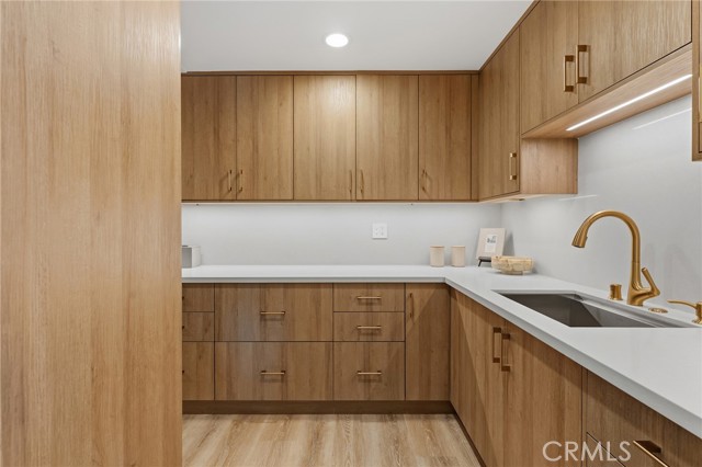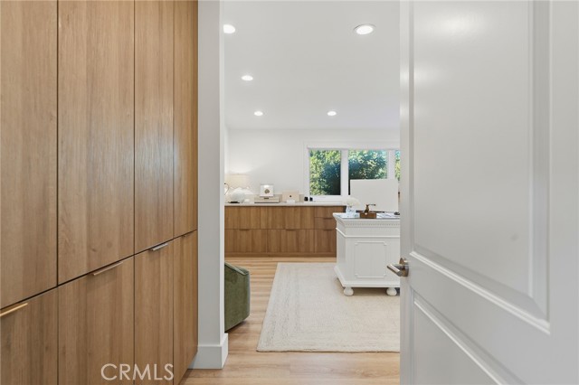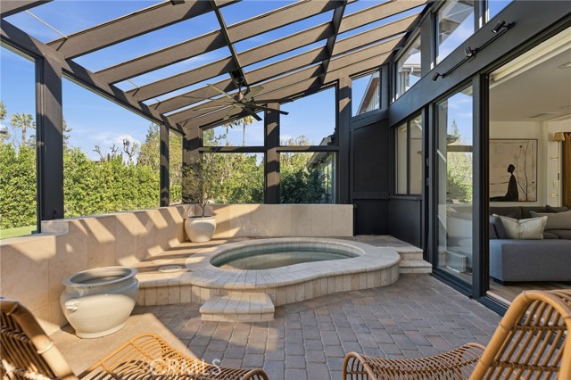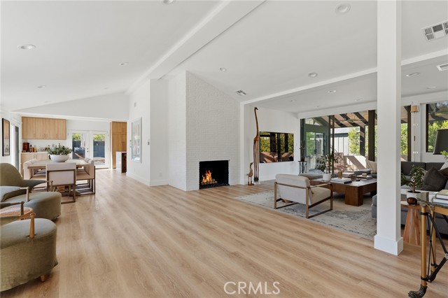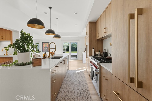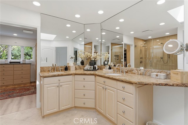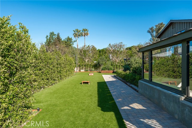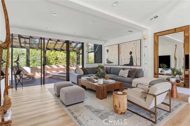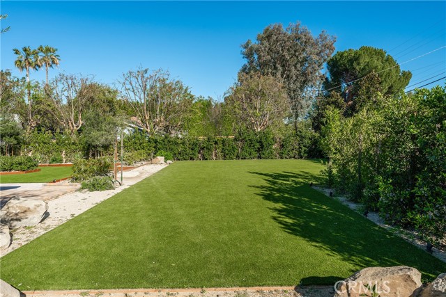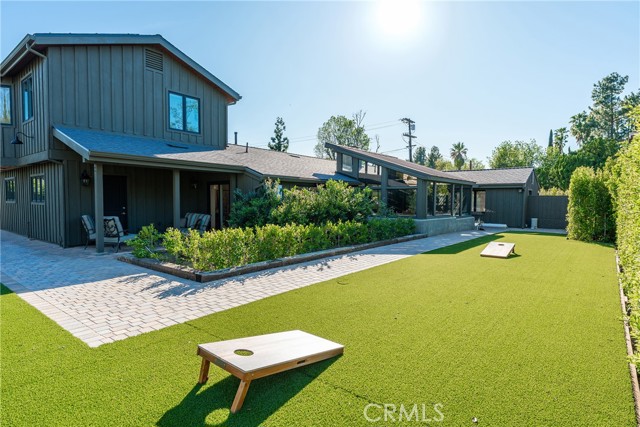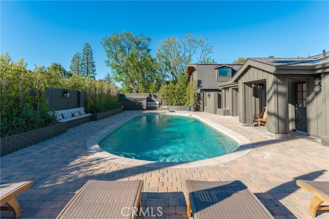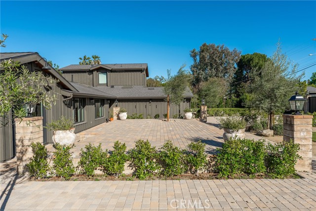 Stunningly remodeled & privately gated estate located on a sweeping 20,000+ SF corner lot in the highly desirable Walnut Acres neighborhood of Woodland Hills. Private security gates open to an expansive paver stone driveway that can accommodate parking for large gatherings. The property is surrounded by sprawling grounds for entertaining that include a resort-style swimming pool with built-in lounge seating, BBQ center with patio space for outdoor dining, glass enclosed sun room with jetted spa for ultimate relaxation, basketball/sports court, synthetic lawns for play, and low maintenance meticulous landscaping including olive trees & wrap-around privacy hedging. Completely reimagined interiors feature a mostly single level sunlit floor plan with incredible indoor/outdoor flow as every room has exterior access. The entry opens to a grand living room with vaulted ceiling, fireplace, and sitting nook with picture window. Gorgeous completely remodeled kitchen boasts center island with breakfast bar seating, quartz waterfall counters, gourmet stainless appliances including Fisher & Paykel refrigeration + Wolf range with 6-burner stove, plus additional “prep” kitchen with second sink & fridge, counter space with fantastic storage cabinetry, & separate laundry area with large capacity washer/dryer. The dining room seamlessly connects the kitchen & living room and has a custom bar with wine fridge. There are 5 spacious bedrooms, 3 located on the first floor, each with access to their own full bathrooms. The primary suite has a bedroom-sized walk-in closet with custom cabinetry & en-suite luxurious bathroom with dual sinks, stone counters, walk-in shower, & toilet room. A junior primary also functions as office with extensive custom built-ins, bedroom-sized storage room/walk-in closet & access to a full bath with dual sinks & walk-in shower. A third bedroom located on its own wing has access to a bathroom with tub/shower. Two secondary upstairs bedrooms each have built-in desks & custom closets. Additional features include: DoorBird intercom/controlled access, ADT security system, pre-wiring for cameras, Pella windows with custom motorized power shades, brand new roof & solar panels, automated exterior lighting, & abundant interior/exterior storage including an outdoor shed with lighting. Adjacent to dining/shopping at the Westfield Mall/Village, Calabasas Commons, local parks/hiking, & zoned for award-winning El Camino & Hale charter schools.