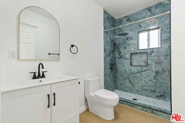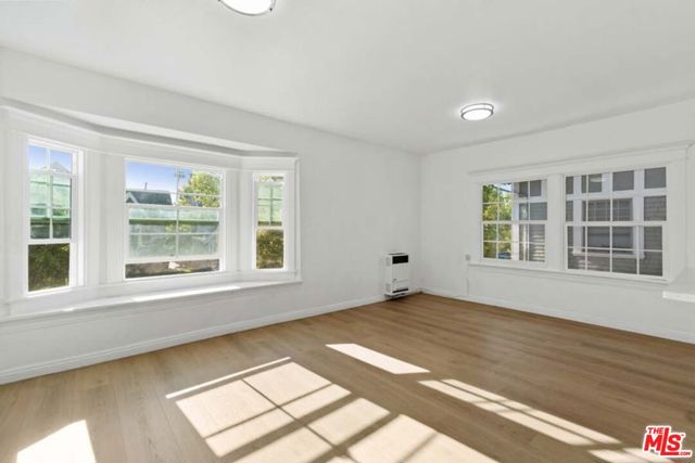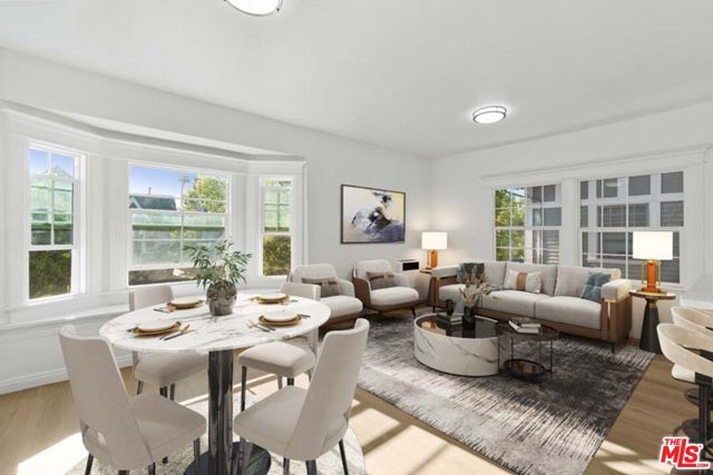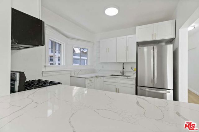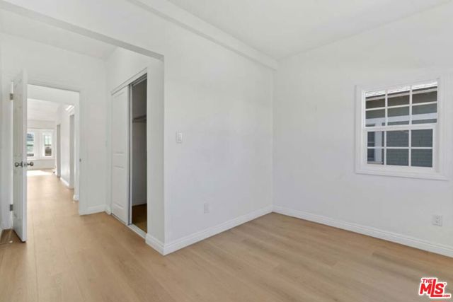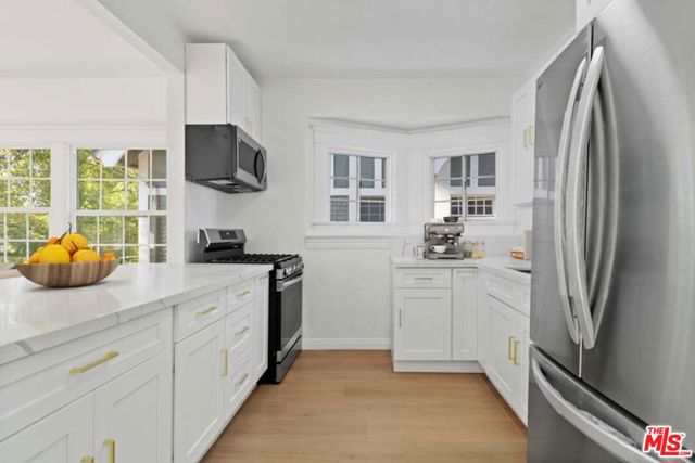 Completely Remodeled 2BD/1BA Bright Upper Unit with 2 Parking Spaces & Security! Ideally situated between 11th St and 12th St in a quiet, low-traffic neighborhood (15 mph residential zone). This second-floor unit features an abundance of natural light with an east-facing orientation and pleasant views. The unit has been fully renovated with brand-new upgrades throughout, including brand new modern kitchen appliances with new cabinets including pantry, granite countertop, refrigerator, microwave, and gas stove, waterproof flooring throughout, new dual-pane windows, and fresh interior paint. The property sits on a large 8,570 sq ft lot and offers excellent amenities: 2 parking spaces included, gated entry with automatic gate, CCTV security system, and additional guest parking available. Just minutes from DTLA, Hancock Park, and Larchmont Village, this property offers easy access to dining, shopping, and public transportation. The convenient location puts you close to Downtown Los Angeles, USC, LA Live, many restaurants and shops, and within easy reach of public transit and freeways. Available for immediate move-in. Don't miss your chance to live in one of L.A.'s most vibrant and central neighborhoods! Virtual staging photos showcase the kitchen, living room, and primary bedroom.