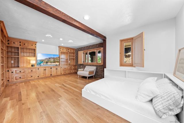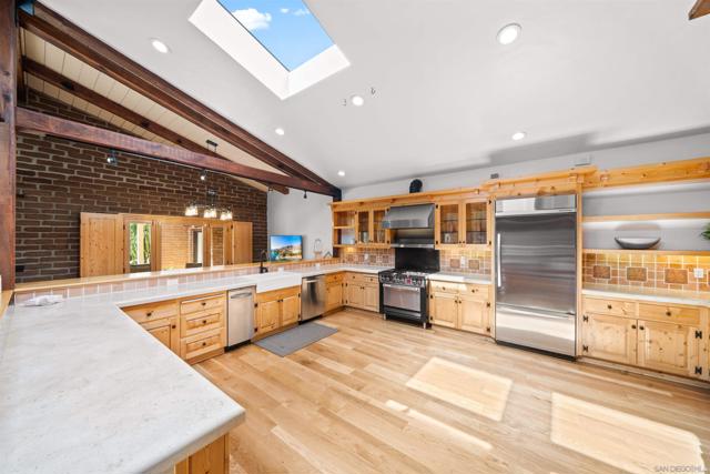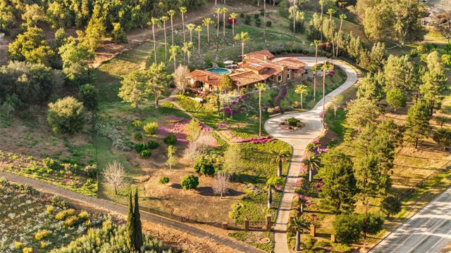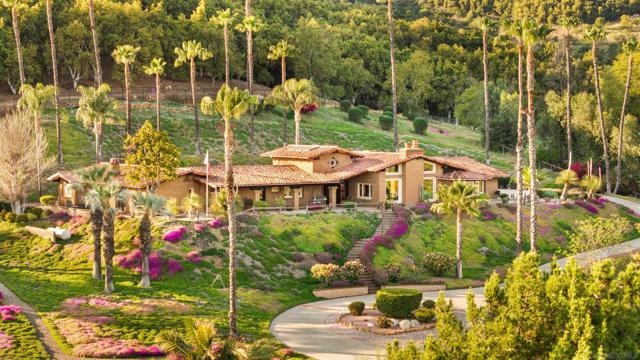 Perched atop a private hillside, this exceptional Spanish-style Adobe estate offers sweeping panoramic views and ultimate privacy on approximately 4.55 acres of beautifully usable land—a rare blend of scale, serenity, and functionality. A long, winding driveway leads through a gated entrance to a warm and inviting residence surrounded by lush landscaping, mature palms, and thoughtfully designed lighting that creates a stunning ambiance at sunset. Designed in timeless Spanish Mission style, the home features authentic adobe construction, clay tile roofing, soaring ceilings, exposed wood beams, and rich architectural details. Expansive windows fill the interior with natural light, highlighting multiple living areas and fireplaces, perfect for both everyday living and entertaining. The open-concept kitchen flows seamlessly into the main living and dining areas, creating an ideal indoor-outdoor California lifestyle. Step outside to expansive grounds with breathtaking sunrise and sunset views, offering space for entertaining, relaxation, or future enhancements. A detached garage provides flexible use as a workshop, studio, or additional storage. The property includes generous flat, usable land with potential for an ADU or additional structures (buyer to verify), ideal for multigenerational living or investment. Recent improvements include a refreshed pool with new equipment, upgraded water heater, refinished flooring, updated bathrooms, new perimeter fencing, enhanced landscaping, and a professionally serviced roof. A rare opportunity!