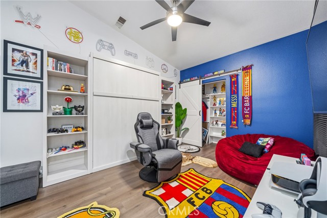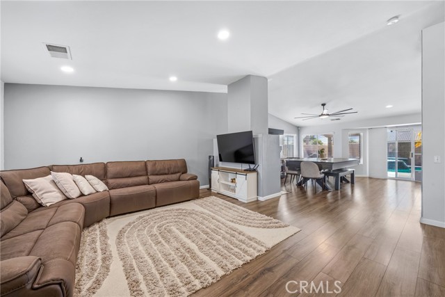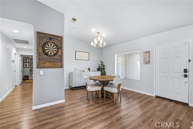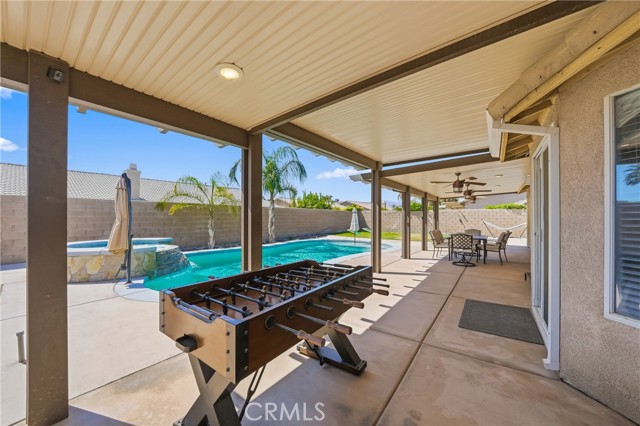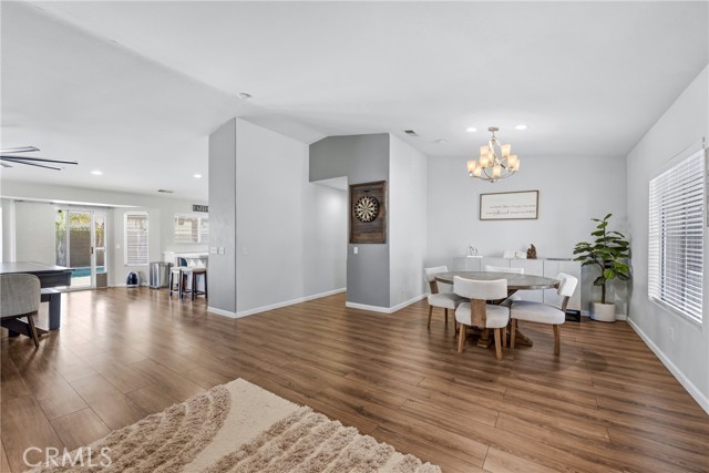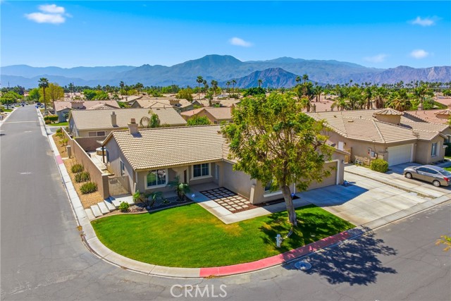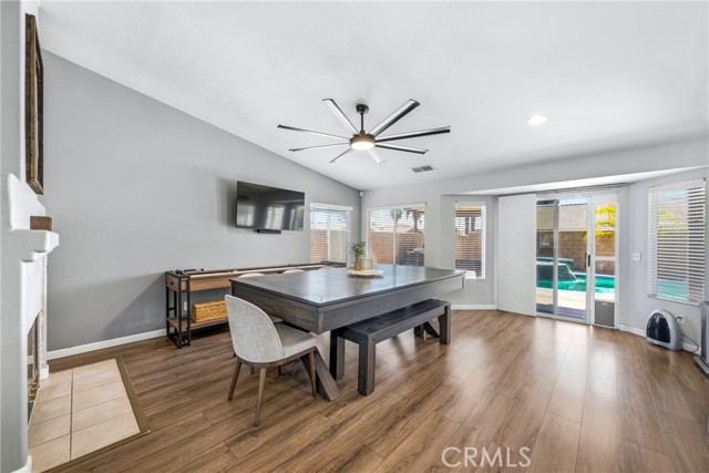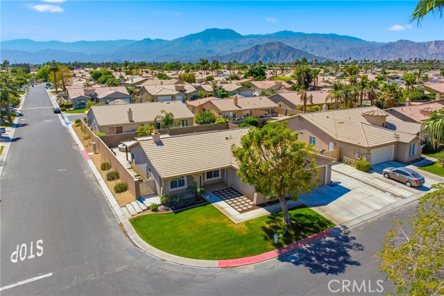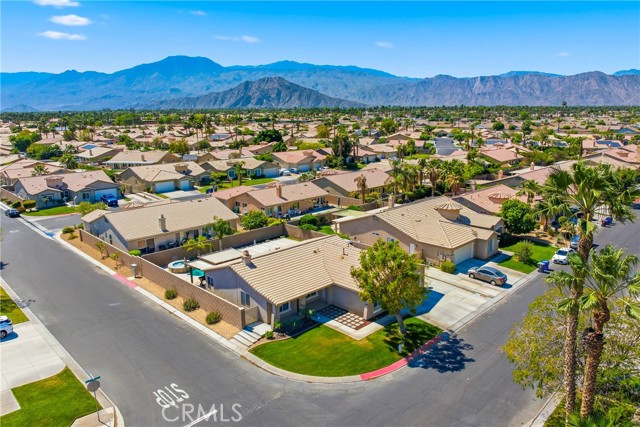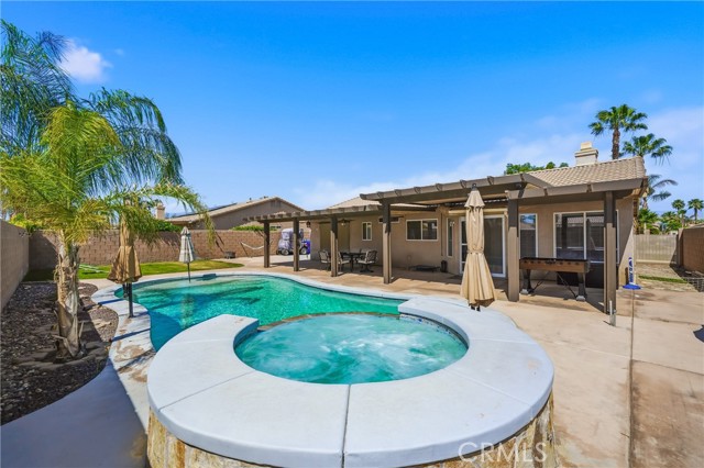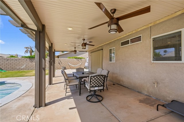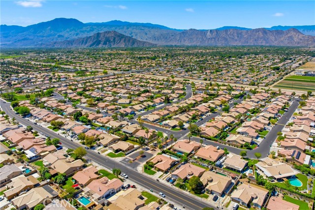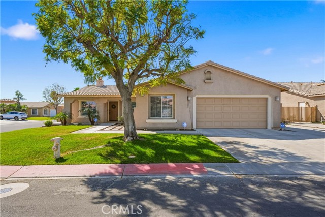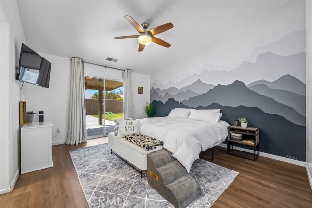Welcome to resort-style living meets modern comfort in the heart of the vibrant Coachella Valley. This beautifully updated single-story home offers an unparalleled indoor-outdoor lifestyle, making it the perfect sanctuary for relaxation and entertainment. Step inside and be greeted by a bright and airy open-concept living room, featuring soaring vaulted ceilings, rich wood-look flooring, and a neutral color palette that creates a fresh and inviting atmosphere. The spacious living area flows seamlessly into the kitchen, which is truly the heart of the home. Boasting crisp white cabinetry, sleek countertops, stainless steel appliances, and an island with bar seating, it’s a space designed for gathering. A cozy fireplace and a separate dining area provide ample room for both intimate dinners and festive celebrations. The home’s thoughtful design extends to the private quarters. The primary suite is a true retreat, featuring a stunning, hand-painted mountain mural that evokes a sense of tranquility. Best of all, it offers direct sliding-door access to the backyard, allowing you to wake up and step right into your personal paradise. The additional bedrooms are equally stylish, with one showcasing a dramatic geometric accent wall, offering comfortable and chic spaces for all. Prepare to be captivated by the spectacular backyard. This private, fully-fenced oasis is an entertainer's dream, centered around a sparkling, freeform pool complete with a cascading spa waterfall. Lounge under the shade of the expansive covered patio, enjoy a barbecue with friends, or play games on the lush lawn surrounded by mature palm trees. This is the epitome of desert living. Located in a quiet Indio neighborhood, you are just moments away from world-class golf, hiking trails, and the renowned dining and entertainment that make the Coachella Valley a premier destination. Experience the perfect blend of style, comfort, and location. Your desert dream home is here!