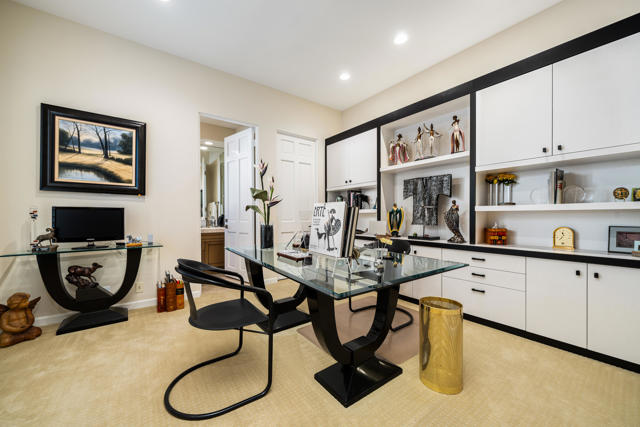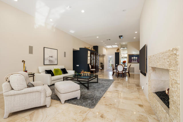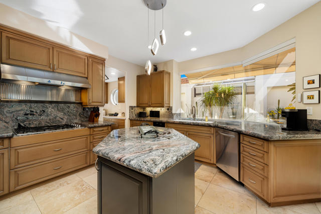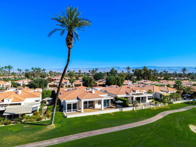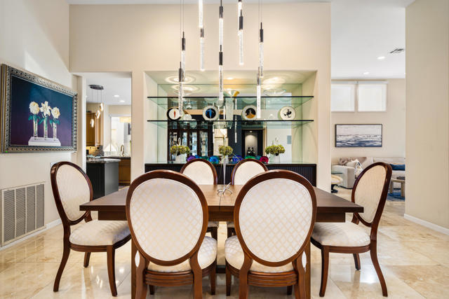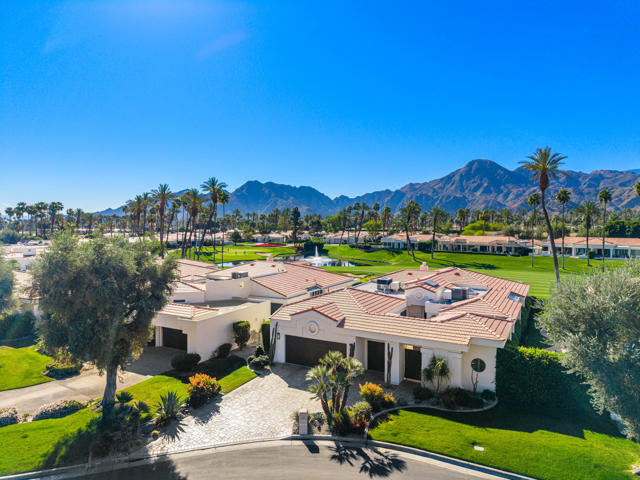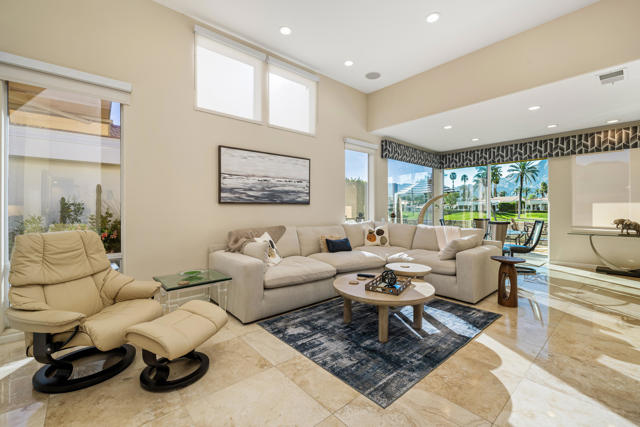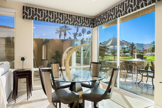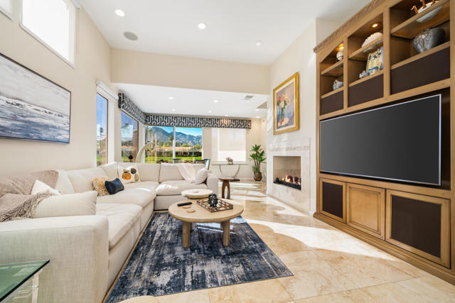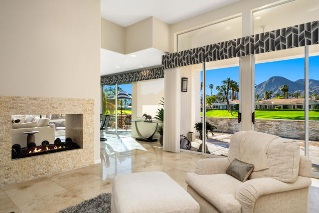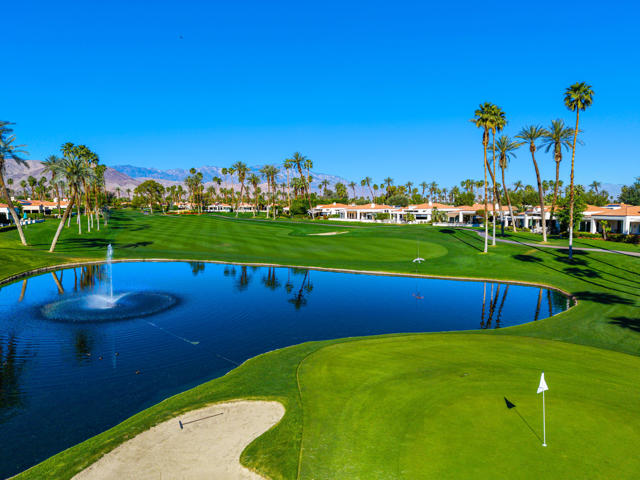 Positioned on one of the premier South-facing interior lots, this exceptional residence captures sweeping, unobstructed views of the 17th fairway, tranquil lake, and dramatic Mountain backdrop. Perfectly situated near the end of a quiet cul-de-sac, the home enjoys an elevated vantage point that maximizes sunlight and showcases the shimmering water, lush green, and surrounding landscape--arguably one of the finest view locations in the community.This beautifully remodeled Hazeltine Floorplan offers approximately 3,400 square feet of refined living space, including 4 bedrooms and 4.5 baths, with a private freestanding casita. Designed to embrace its stunning setting, the expansive rear patio is an features a soothing custom water feature across the back patio and ideal orientation for enjoying breathtaking desert sunsets over the fairway and mountains. Inside, the home has been thoughtfully upgraded with travertine flooring, granite countertops, custom cabinetry, and updated lighting throughout, complemented by tasteful designer furnishings. The spacious kitchen opens seamlessly to the living areas, all oriented to capture the spectacular views beyond. The Primary Suite is a private retreat, separate his-and-hers bath areas. Guests are comfortably accommodated in the main home and detached casita, offering both privacy and flexibility.Located just steps from the Community Pool and Spa, this home combines luxury, comfort, and an unmatched view setting--truly a rare opportunity in Desert Horizons.