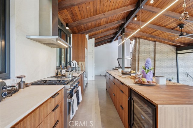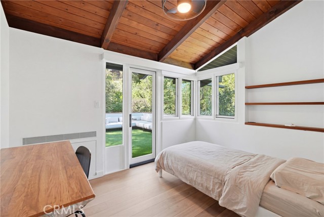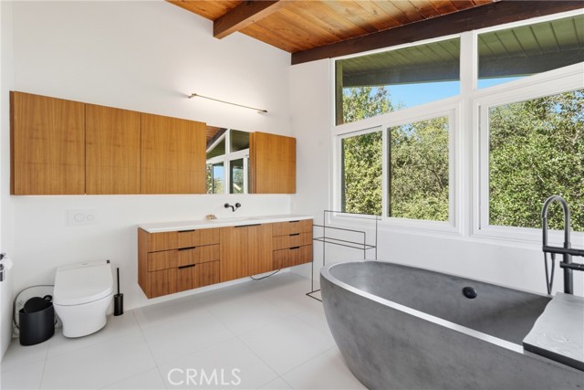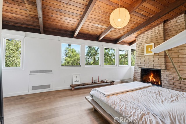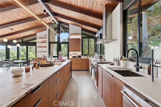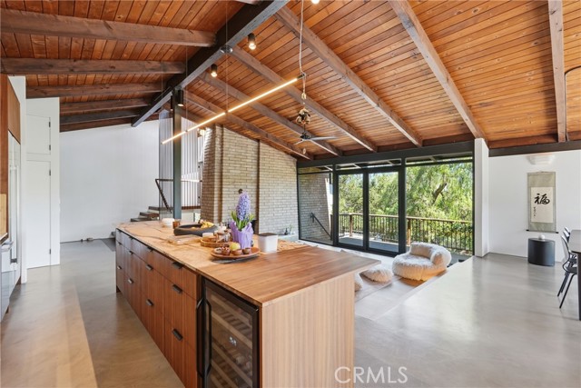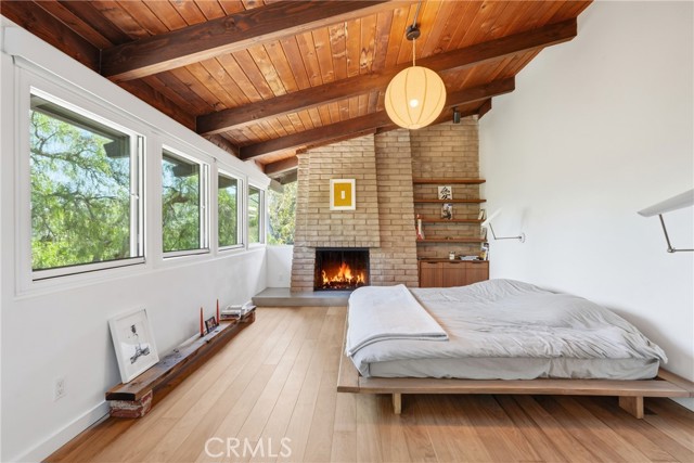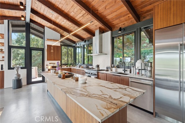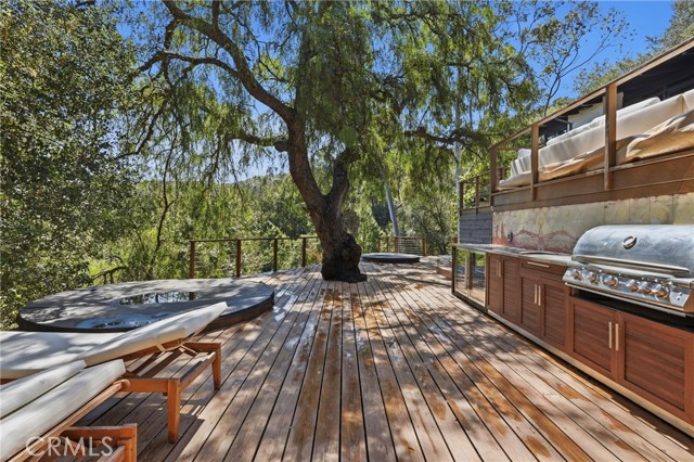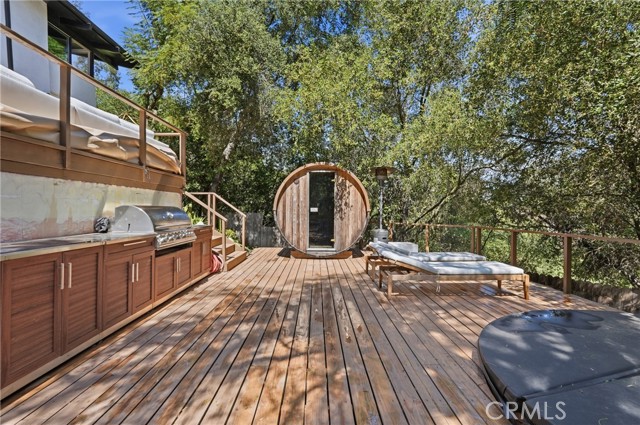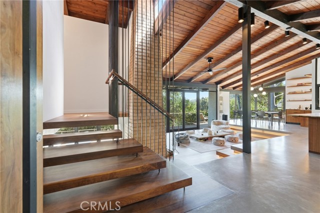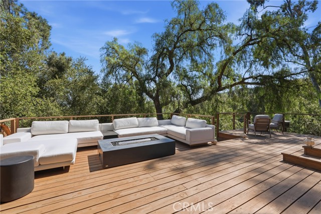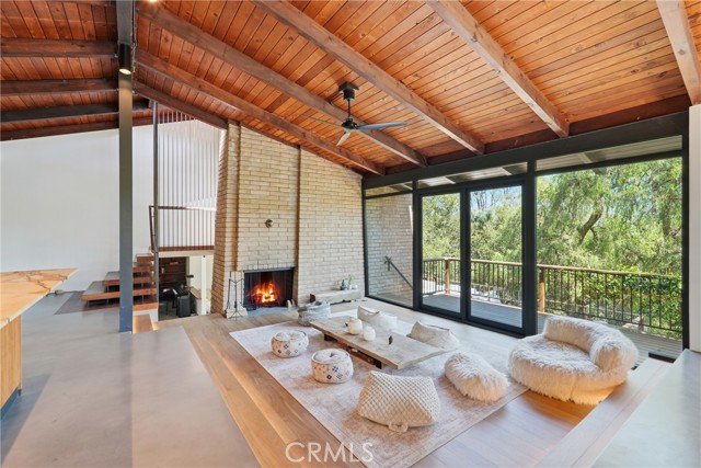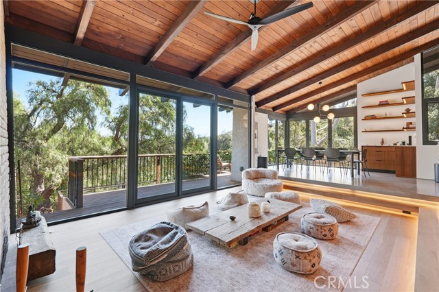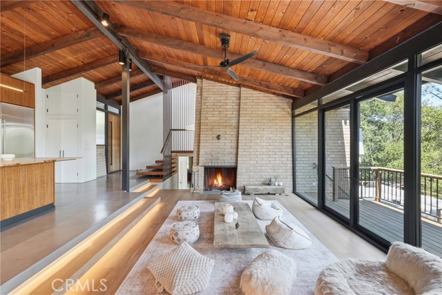 Private 3-acre Topanga retreat with panoramic canyon and mountain views, resort-style amenities, and seamless indoor-outdoor living. Tucked away in the highly sought-after Upper Fernwood neighborhood of Topanga, this mid-century residence offers a rare blend of privacy, architecture, and lifestyle. Set on nearly 3 acres and surrounded by lush natural landscape, the home showcases expansive walls of glass that frame breathtaking canyon and mountain views while filling the interiors with natural light. The home features an open-concept living and entertaining space with clean modern lines, warm wood finishes, and a relaxed yet elevated design. A stunning great room with vaulted wood-beamed ceilings and a statement fireplace serves as the heart of the home, while a dedicated dining area captures serene views through floor-to-ceiling glass doors that open to the surrounding decks. The chef’s kitchen is equipped with Wolf and Sub-Zero appliances, custom cabinetry, and stone countertops, seamlessly connecting to the main living areas. The primary suite offers a tranquil retreat with a fireplace and abundant natural light, complemented by a spa-inspired bathroom featuring a freestanding soaking tub, walk-in shower, and peaceful nature views. Additional bathrooms feature modern finishes, including a sleek secondary bath with stone surfaces and custom fixtures, along with a designer powder room. Additional bedrooms are bright and inviting, many with direct outdoor access, while a separate office provides an ideal work-from-home setting. Designed for a true wellness lifestyle, the outdoor spaces are exceptional. Expansive wood decks offer multiple seating and dining areas with sweeping views, a built-in outdoor kitchen with BBQ, lounge areas with fire feature, hot tub, cold plunge, and a private barrel sauna. A private trail and bridge lead to a yoga and viewing deck overlooking the surrounding mountains. The grounds feature mature landscaping including fruit trees, enhancing the natural and private setting. Additional features include radiant heated floors throughout, a Tesla EV charger, a spacious driveway, covered parking, and a private turf courtyard. Set in a peaceful, nature-rich setting near Topanga’s most desirable hiking trails, the property offers privacy while still being within convenient reach of Los Angeles. The property is presented as a fully furnished residence, with the option for unfurnished occupancy.
