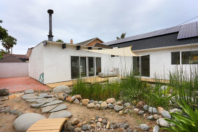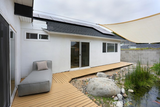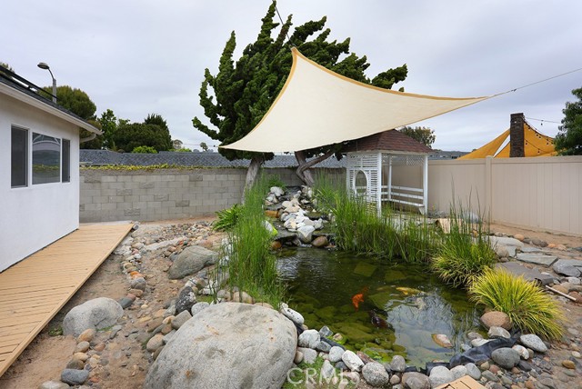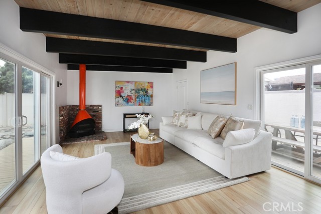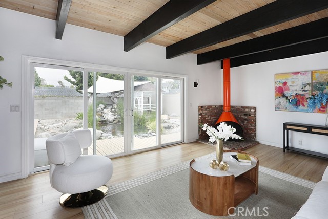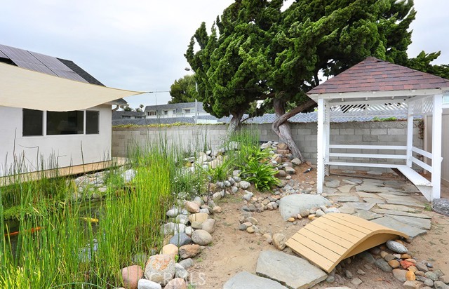 Single-story Huntington Beach home with distinctive architectural character, generous living spaces, and a private garden-style backyard. Brand-new roof. Vaulted wood-beam ceilings and walls of glass bring natural light into the main living area, featuring a fireplace and access to outdoor patios. The kitchen includes granite countertops, custom cabinetry, built-in appliances, and an oversized breakfast bar. Spacious bedrooms include a large primary suite with updated bath. A large den provides flexible space for an office, family room, or additional bedroom. Backyard features wraparound decking, tranquil pond, mature landscaping, and gazebo. Interior laundry, large garage with generous storage space, and inviting curb appeal. Convenient Huntington Beach location near shopping, dining, parks, and coastal amenities.