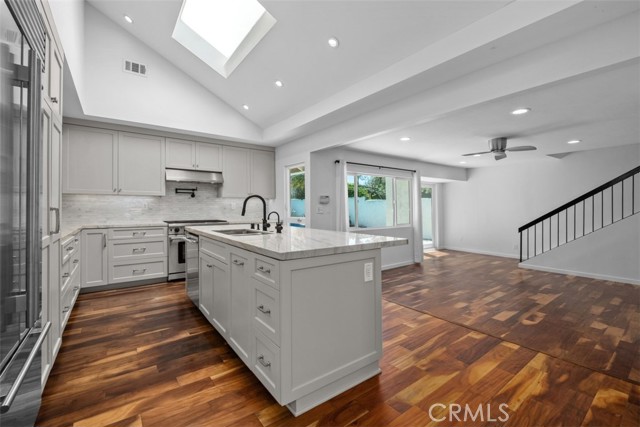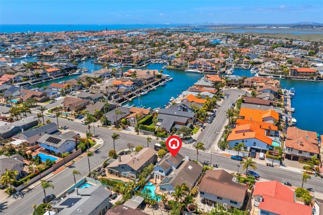 Welcome to your coastal retreat on Humboldt Island in the coveted Huntington Harbour community. Originally a single-story home, this expanded residence offers a flexible layout with a main-floor primary suite featuring a spacious 10' x 12' walk-in closet and an upgraded bathroom with a stylish barn door. A second bedroom on the main level works perfectly as an office or guest room, along with a separate family room for added living space. Upstairs, three additional bedrooms and a full bath create ideal separate living quarters for guests or extended family. The remodeled kitchen is a standout, complete with a 6-burner Thor stove, Sub-Zero refrigerator, marble island, pot filler, and custom countertops, plus a custom wine closet for entertaining. The home also features a large separate family room, wood flooring, a living room with fireplace, vaulted ceilings and skylights, and a custom glass front door. Owned solar and a water softener add efficiency and comfort. Outside, enjoy a private backyard with pool, spa, and yard space. Located in Huntington Harbour, you’re surrounded by a vibrant lifestyle with yacht clubs, water sports, kayaking, paddleboarding, Duffy boating, and a strong sense of community through local organizations and events.