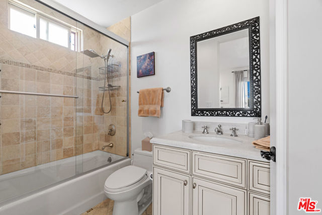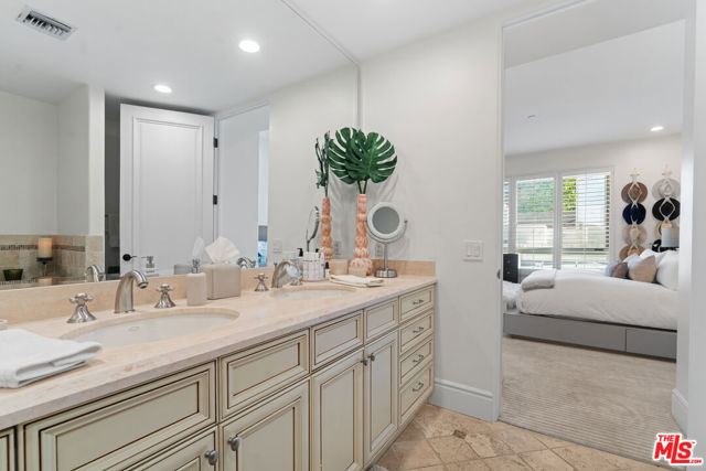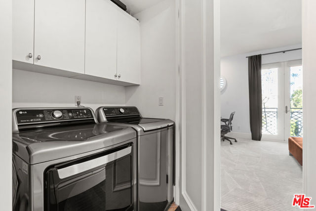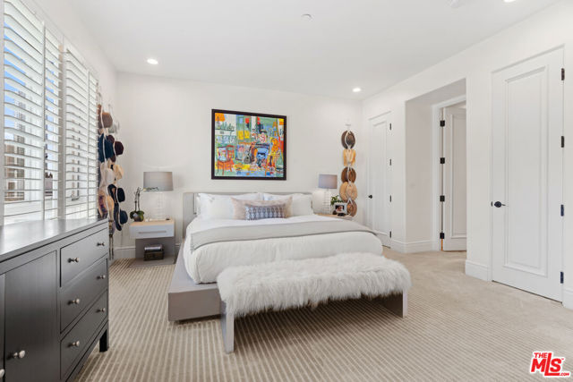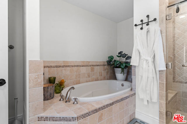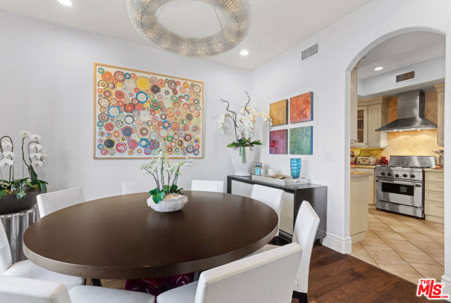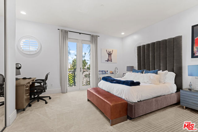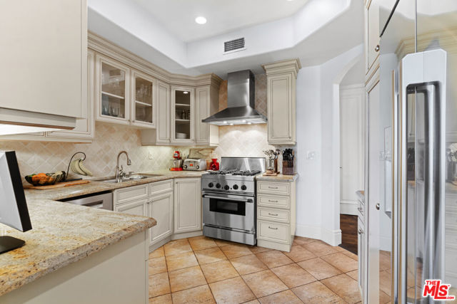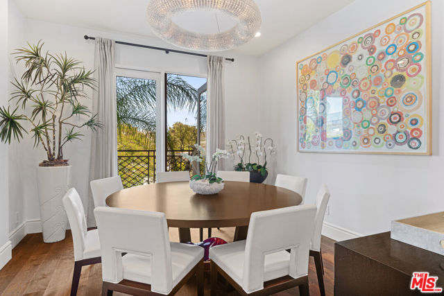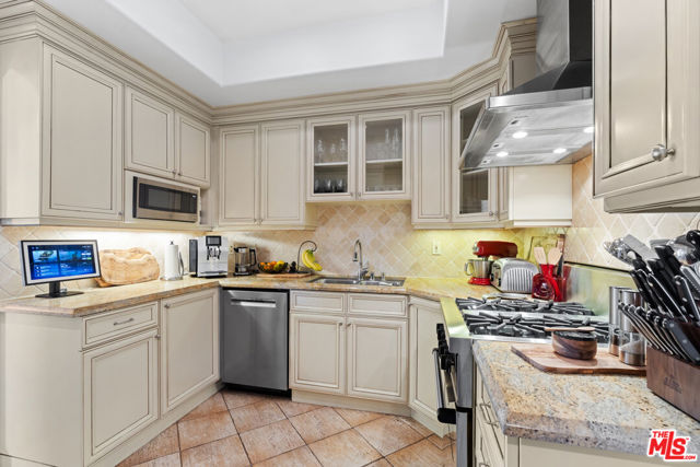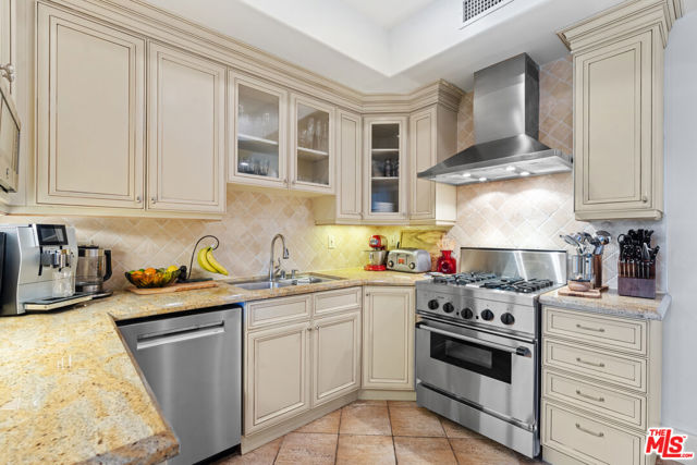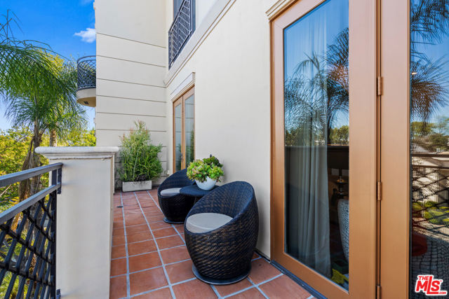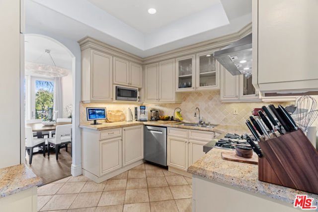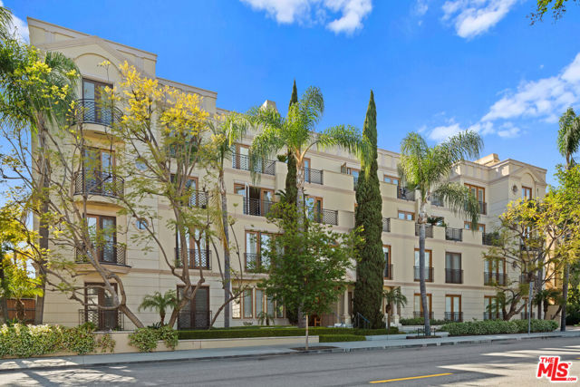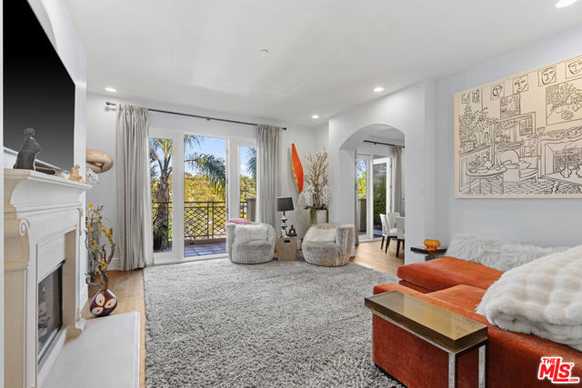 Spaulding Peninsula, Beverly Hills Condo! 2 bedrooms and 2.5 bathrooms. The open floor plan living room with a beautiful fireplace and spacious corner balcony is adjacent to a formal dining room, which is perfect for entertaining guests. Features gorgeous arches, hardwood floors, and recessed lighting. The chef's kitchen is complete with stainless steel appliances, ample cabinetry and tile flooring. The primary bedroom and en-suite has a stunning custom tile bathroom with double vanities, an oversized soaking tub, separate shower, and massive walk-in closet. The second bedroom is also en-suite with a shower/tub combo, sliding closet doors, and a Juliet balcony. Both bedrooms are light and bright with brand new carpeting. The unit also features central air conditioning, in-unit washer/dryer and two side-by-side parking spaces in the community parking garage. The building features controlled access, extra storage, and four guest parking spots. Enjoy the night view of Waldorf Astoria Beverly Hills Hotel or Century City from the community rooftop deck. This building is located seconds from the famous Rodeo Dr, shops, restaurants in the golden triangle. Don't miss your chance to live in the heart of Beverly Hills. Bonus: EV charger installed in parking stall.